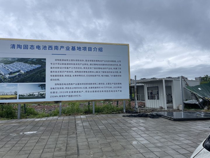 9月5日,记者来到成都郫都区弥陀村,辗转找到了清陶固态电池西南产业基地,这是成都清陶二期项目,主要生产固态电池电芯及系统。根据项目建设的规划,2025年启动建设,2028年全面建成投产,15GWh新增年产值超100亿元。
